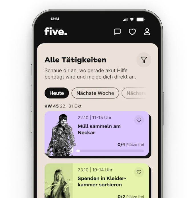 Weil wir daran glauben, dass sich mehr Menschen engagieren würden, wenn der Zugang einfacher und die Engagements flexibler wären. Viele Menschen wollen sich engagieren, doch komplizierte Anmeldeprozesse halten sie zurück. Gleichzeitig suchen gemeinnützige Organisationen und Initiativen dringend Unterstützung. Deshalb gibt es five. – wir verstehen uns als Türöffner - mit dem man kurzfristig, flexibel und mit nur wenigen Klicks direkt ins Engagement einsteigen kann. Lasst uns gemeinsam kreative Angebote schaffen, die zu mehr Engagement führen. Denn am Ende gewinnen alle: die Engagierten, die Organisationen und vor allem die Menschen, Tiere und die Natur, die auf dieses Engagement angewiesen sind.